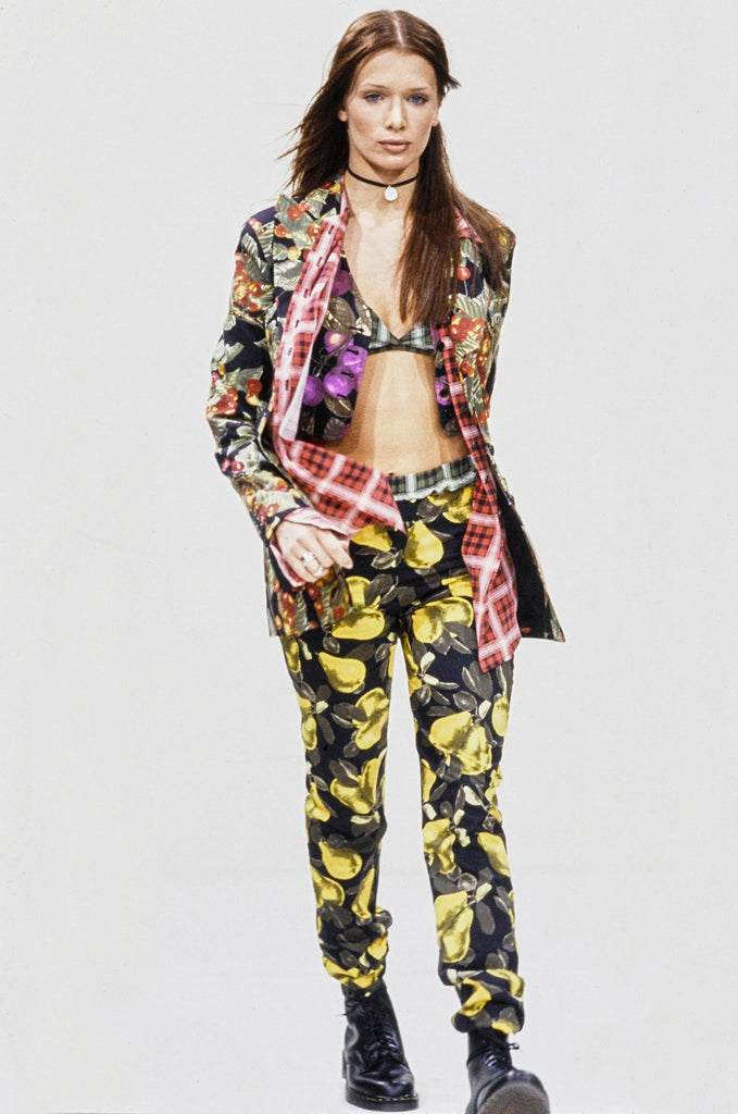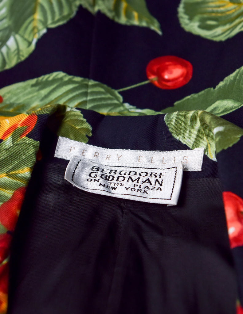 A slice of iconic fashion history right here. This blazer hails from the one and only Perry Ellis Grunge Collection, designed by Marc Jacobs, Spring/Summer 1993. It is well known that at the time this collection was poorly received, and ultimately led to the dismissal of Jacobs from the label. The critics got it wrong, and the collection went on to be a celebrated, highly influential piece of 1990s fashion history, spurring a successful career for Marc Jacobs, who has become renowned for his cultural-referencing collections. This cotton jacket is black with a vivid cherry print, a print that ran through several looks of the collection. It has two pockets at the front hips, and one pocket at the bust. Two button front, with three decorative buttons at each cuff. Four point collar. Fully lined.