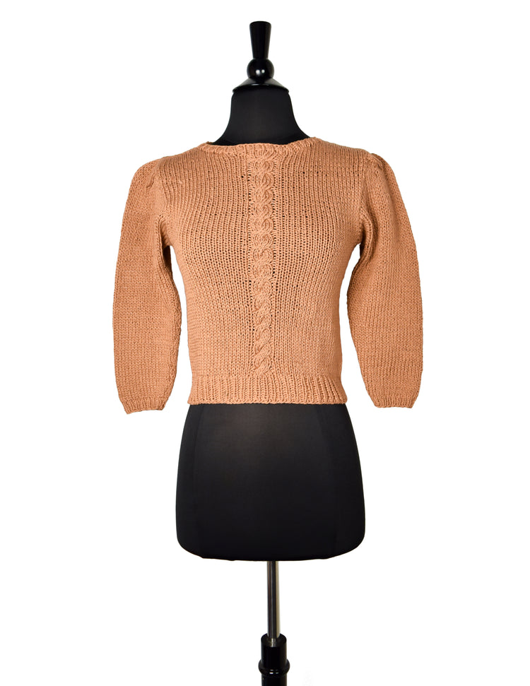 Super cute vintage sweater from the early 1990s, by Perry Ellis. Adorable fit, hand knit, cotton, with a cable knit detail running down the front. Slight puff at shoulders. Quartered sleeves. A great sweater for Spring and Summer nights.