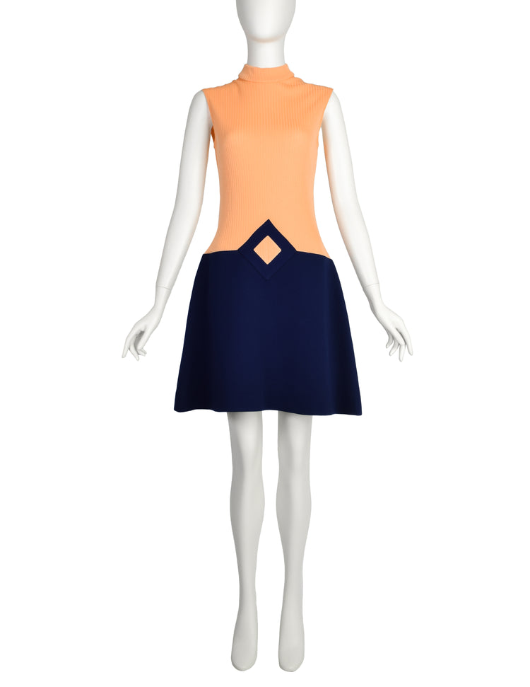 Pierre Cardin les Jerseys Vintage 1960s Ribbed Peach Navy Blue Structured Mod Shift Dress