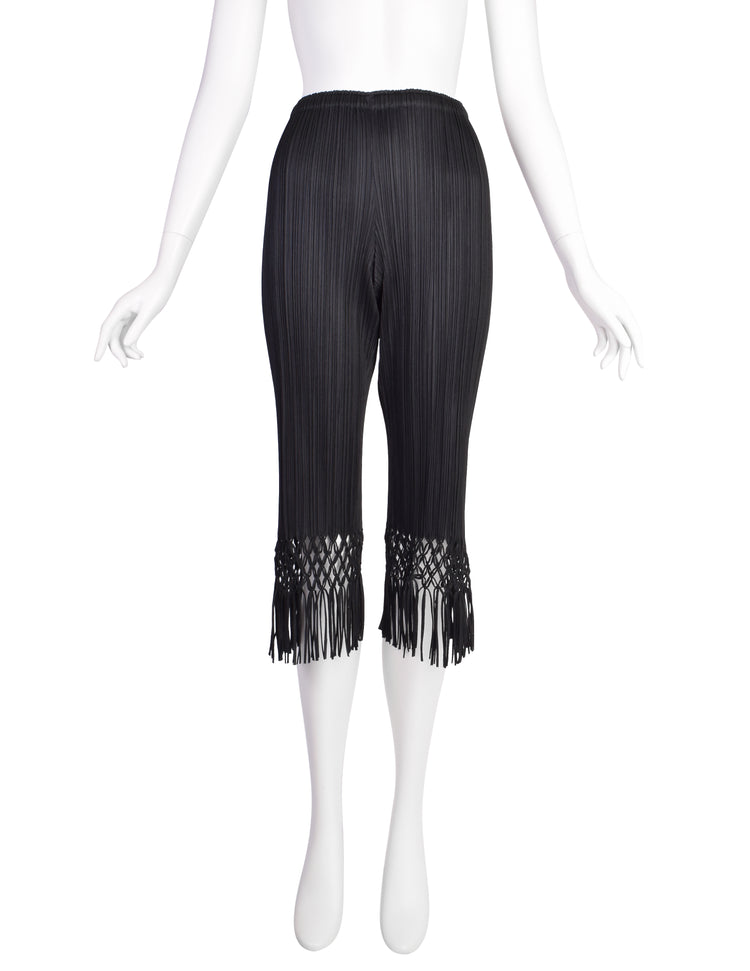 Pleats Please by Issey Miyake Vintage Black Pleated Cropped Macrame Fringe Capri Pants