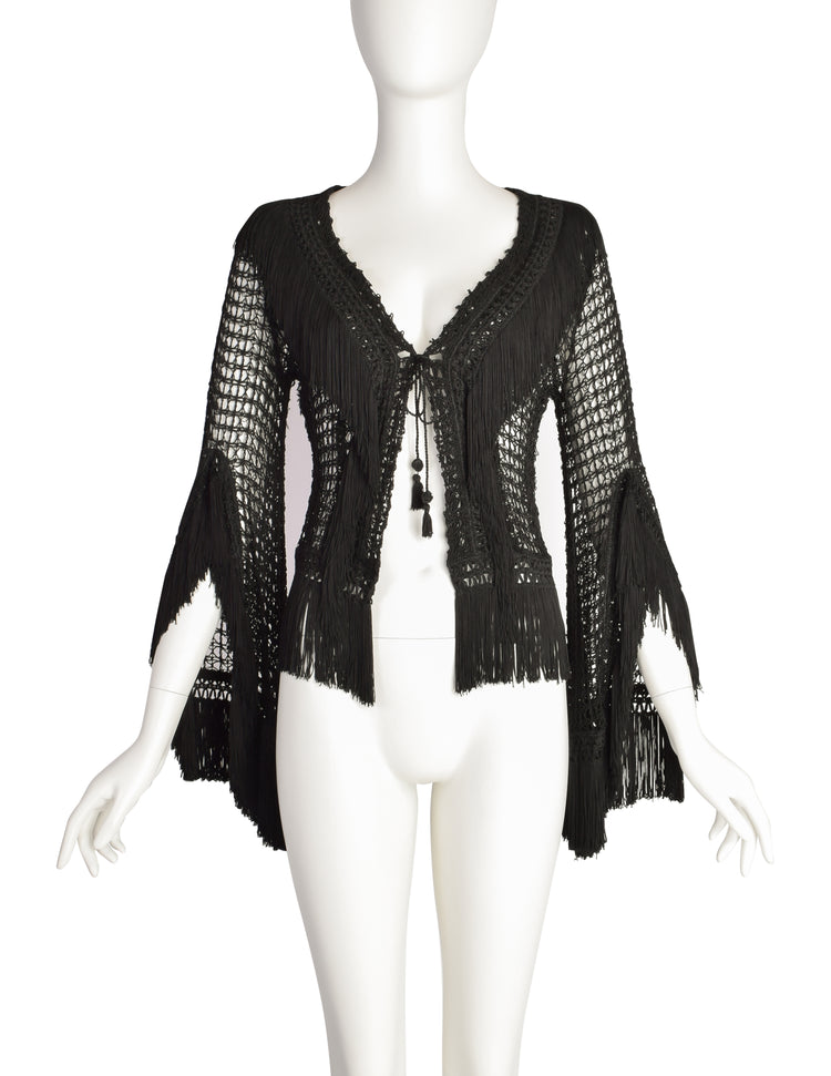Gorgeous vintage Plein Sud piece from the 1990s. This beautiful cardigan is comprised of an intricate black open macrame. Lengthy fringe trims the neckline, front, bottom, and cuffs. Stunning bell shaped, cropped sleeves that open at the front elbow and cascade toward to back of the arm. Single adjustable silken cord closure at front bust.