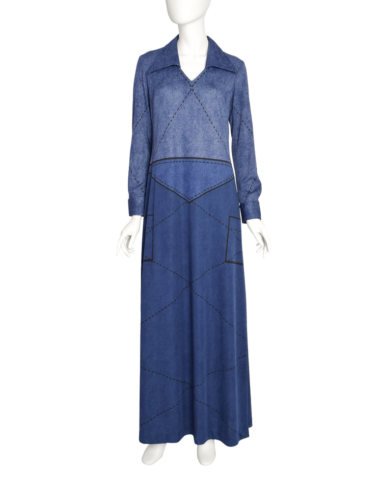 Stunning vintage 1970s dress by Roberta di Camerino. Trompe L'oeil denim print in shades of blue, with black 'stitch' print details, giving an amazing effect. Pointed collar. Long sleeves with buttoned cuffs, complete with Roberta's R logo gold tone buttons. Full length maxi dress in poly jersey.