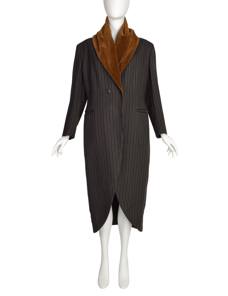 Romeo Gigli Vintage AW 1989 Black Grey Striped Wool Brown Velvet Shawl Collar Hooded Coat