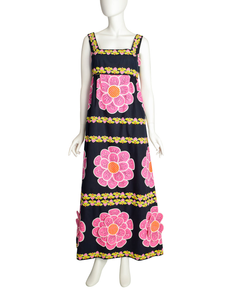 Captivating vintage dress from the late 1960s. This fun piece comes in the deepest blue based black with a vibrant, vivid contrasting print in pink, orange, green, and white. Large scale floral with the most amazing 3D, quilted applique along the bottom flowers - so unique and super cool. Empire waist trimmed in piping. Fully lined. Zip up back.