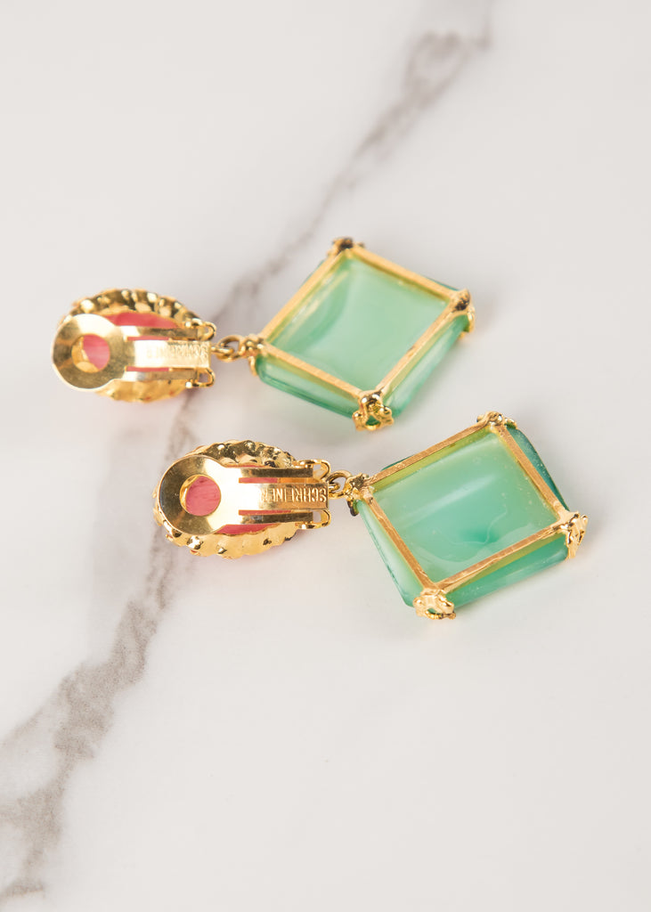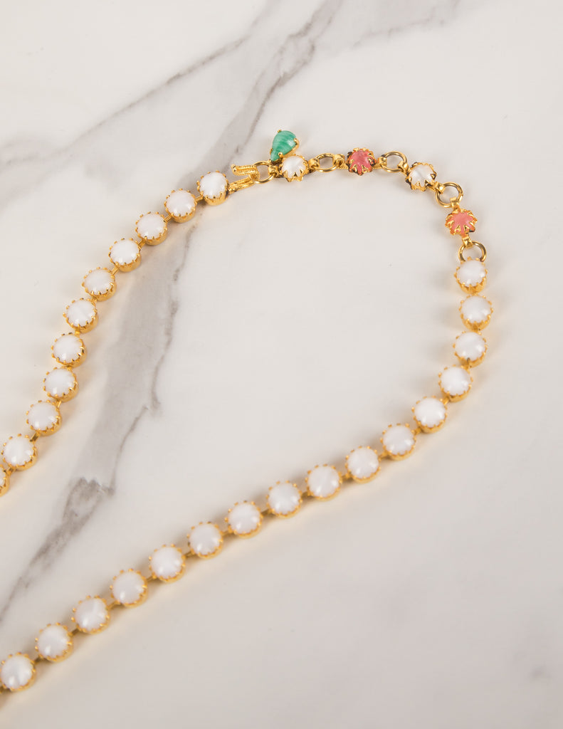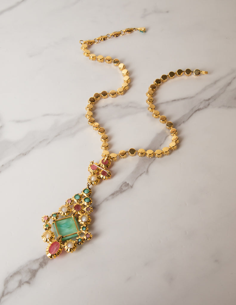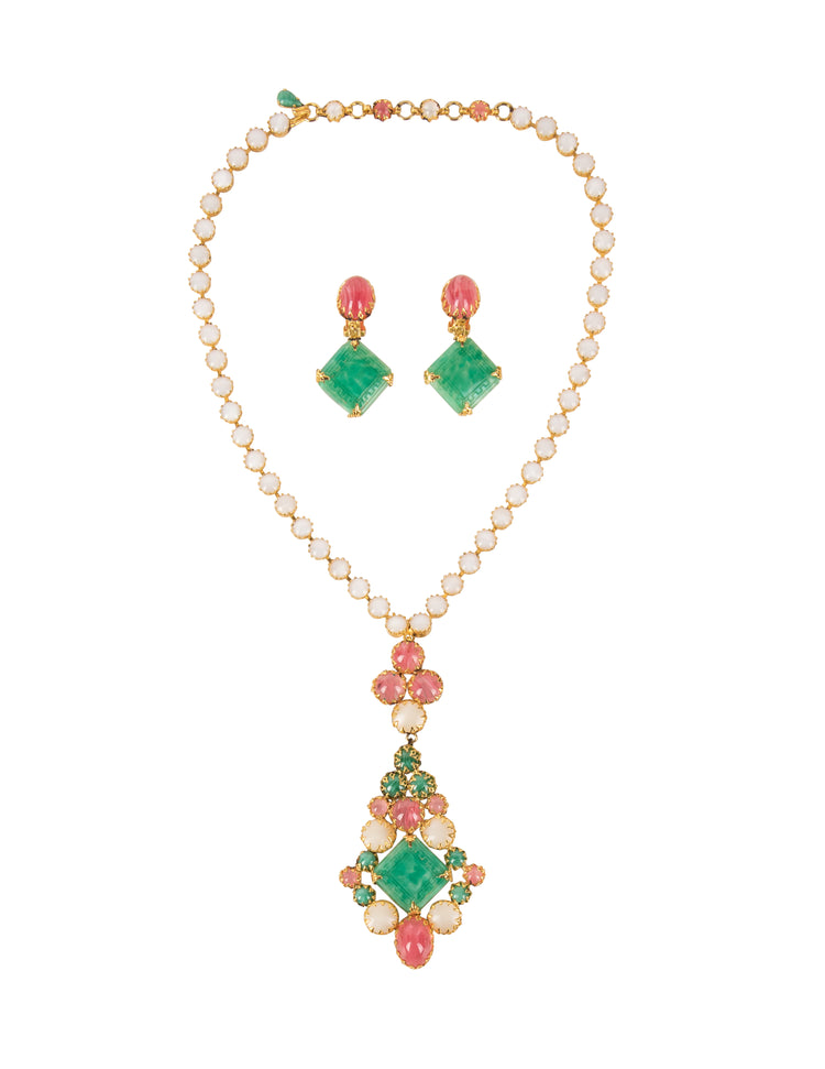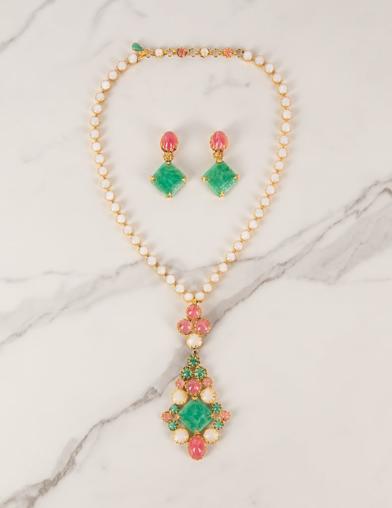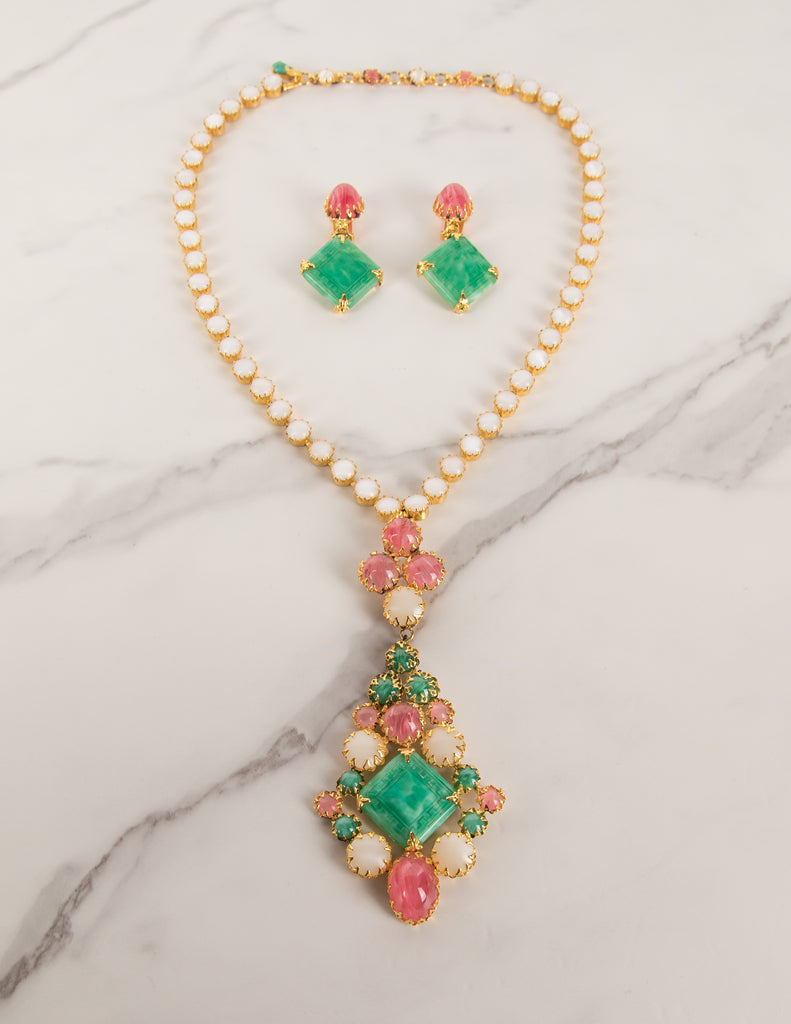 Schreiner Vintage 1960s Green Pink White Necklace and Earrings Set