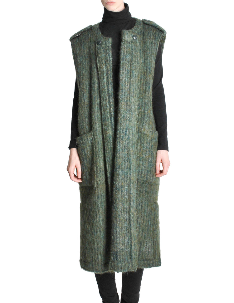 Vintage 1980s Ted Lapidus maxi vest. Mohair, in shades of green. Pockets at hips. Buttoned tab detail on each shoulder. Thick wool/mohair blend suitable for fall and winter.