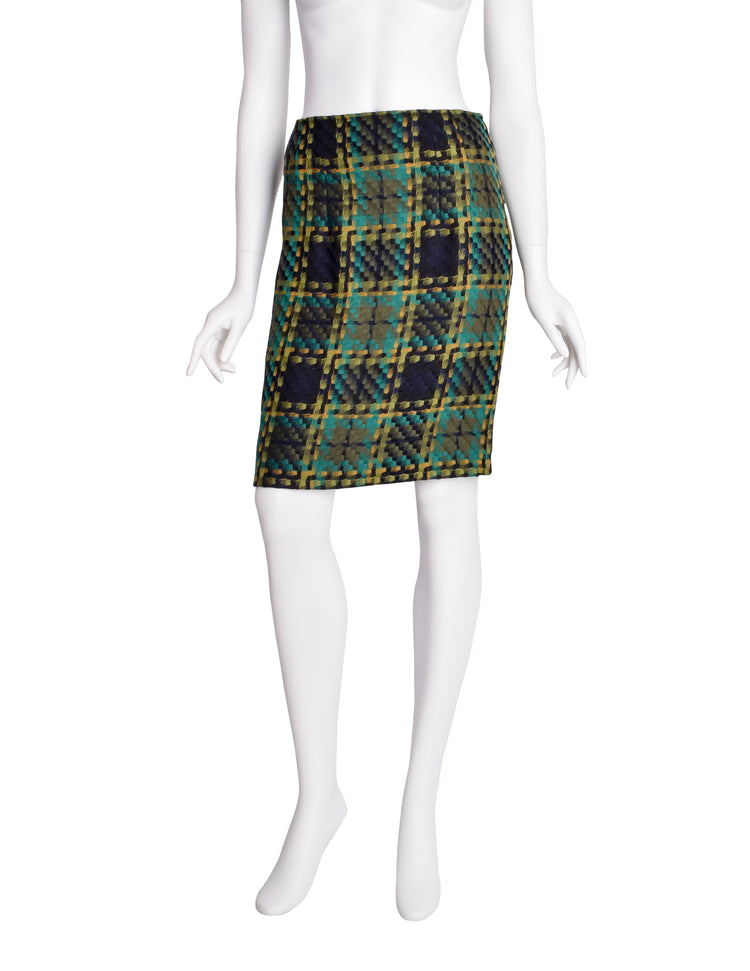Todd Oldham Vintage AW 1996 Green and Yellow Plaid Woven Wool Pencil Skirt