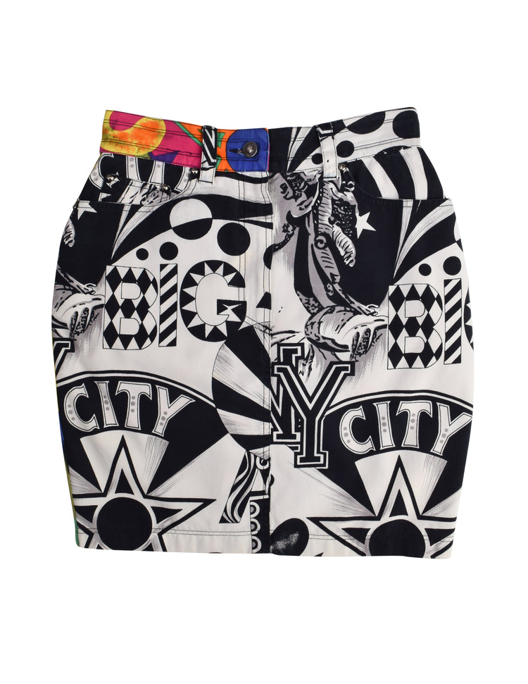 Insane, amazing, and rare vintage Versace skirt, from the late 1980s/early 1990s. This super cool print is New York themed, with NY, "Big City", the Statue of Liberty, and more. Black and white front side and mulitcolor back side. Pockets at front and back. Zip fly. A collectible and fun piece.