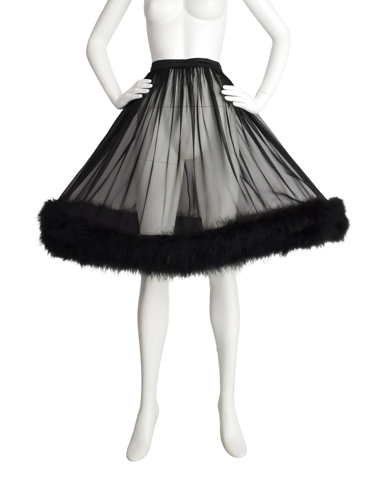 This incredible 1950s piece is as adorable as it is sexy. Black sheer chiffon full sweep petticoat skirt featuring a full marabou feather trim wrapping around it's boned/structured bottom, which keeps it's big circle shape extended at all times. Trimming also features black satin both at the bottom behind the marabou, as well as at the high waistline. Keyhole and dual snap closure, concealed with a satin bow. Very in love with this rare beauty!