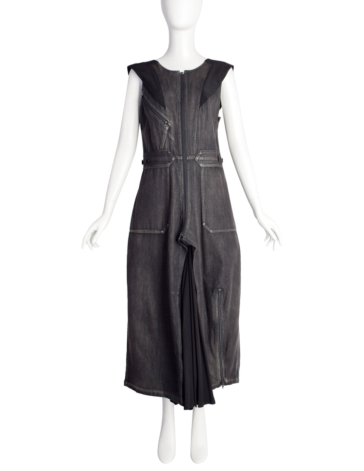 Incredibly cool and unique vintage Yohji Yamamoto dress, from Fall/Winter 2002, shown here documented on the runway. This utility style dress has an intentional, slightly oversized fit. Deep blue/grey wash denim, resembling a deconstructed overall/jumpsuit. Amazing details throughout. Zipper details at upper side, leg, and along the front - with the front opening up to reveal a black silk panel (as shown in the photos). Black silk panel details at front, sides, upper, and back side train. Pockets at hips. Adjustable buttoned waist. Gathered yoke at back bodice.