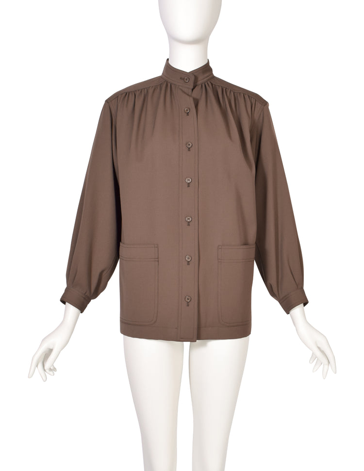Chic vintage 1970s jacket by Yves Saint Laurent. Very classic YSL, this jacket has a straight silhouette reminiscent of old French workwear, with a band collar. Slightly puffy sleeves with buttoned cuffs. Large patch pockets at front hips. Gathered yoke at front and back shoulders. A beautiful mocha-esque coffee with milk brown wool gabardine. Button up front. Fully lined.
