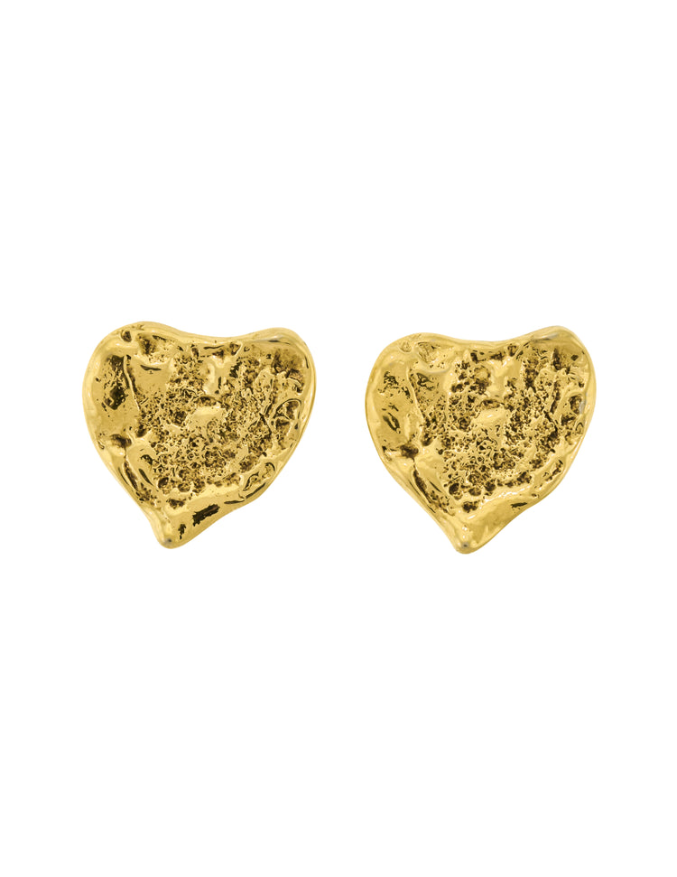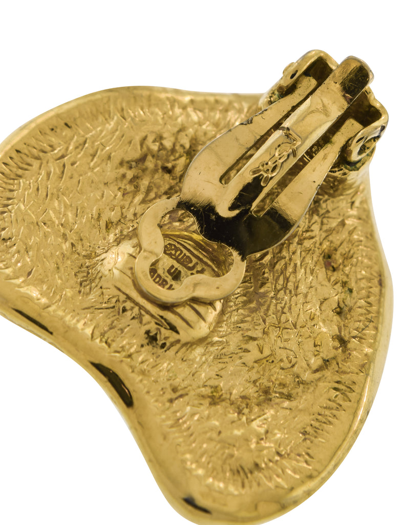 Gorgeous vintage Yves Saint Laurent earrings from the early 1990s. This design by Robert Goossens is iconic and lovely, featuring gold gilt, textured, nugget-like hammered hearts. Beautiful shade of golden plating with dimensional darkening within, intentional with the manufacturing, adding a stunning depth. Signed backside. Clip on.