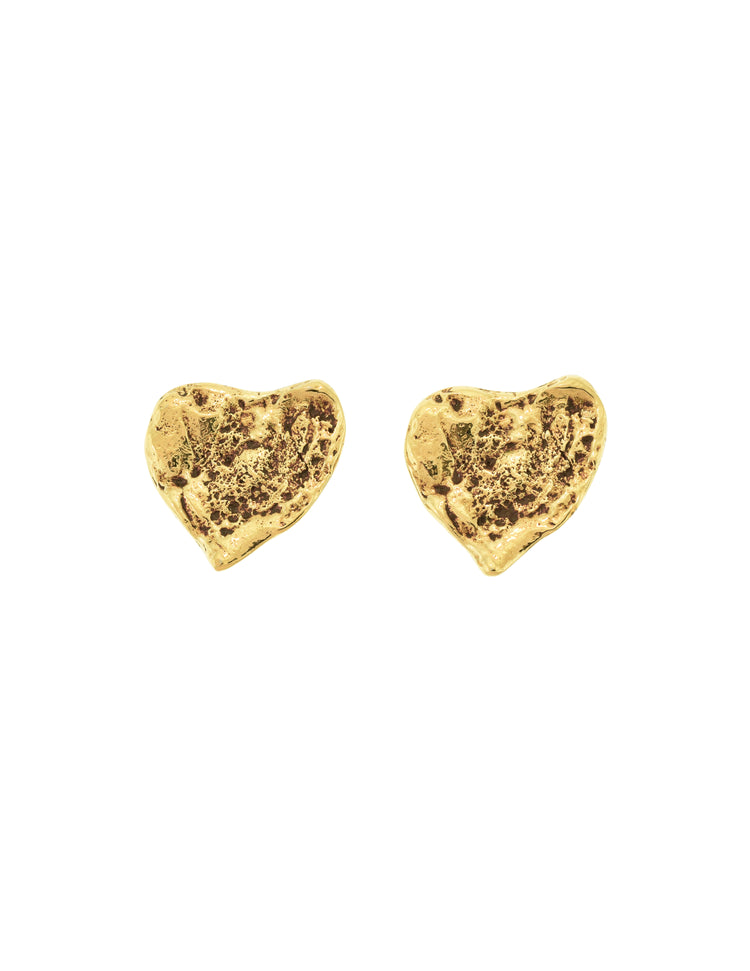 Gorgeous vintage Yves Saint Laurent earrings from the early 1990s. This design by Robert Goossens is iconic and lovely, featuring gold gilt, textured, nugget-like hammered hearts. Beautiful shade of golden plating with dimensional darkening within, intentional with the manufacturing, adding a stunning depth. Signed backside. Clip on.