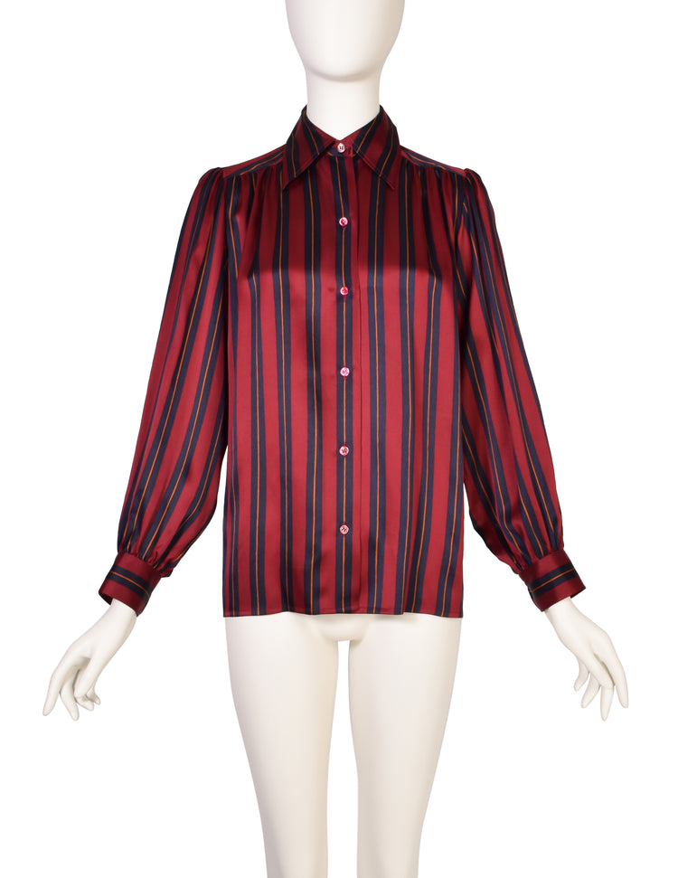 Yves Saint Laurent Vintage Maroon Navy Striped Silk Charmeuse Button Up Shirt