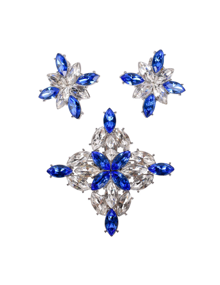 Yves Saint Laurent Vintage Numbered Large Blue Clear Crystal Brooch and Earrings Set