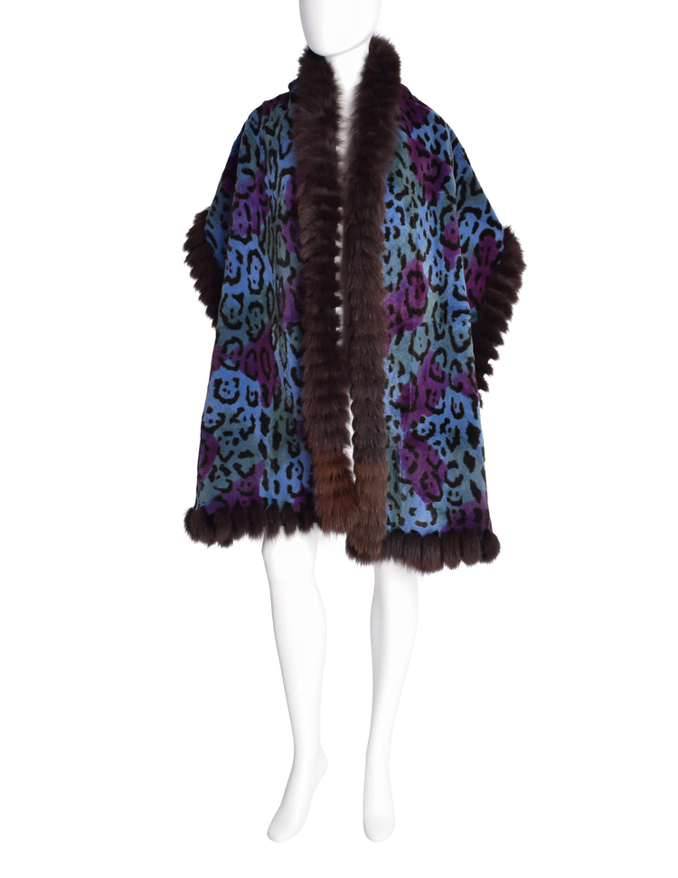 Completely gorgeous vintage 1980s YSL fur shawl. Oversized, this Yves Saint Laurent stole/shawl functions as a massive wrap and could certainly be used as a throw. Softest, sheared fur with a multicolor purple, blue, green, and black large scale leopard print, trimmed in fluffy banded brown fox fur. Inner side is lined in blue wool. So luxurious and beautiful.
