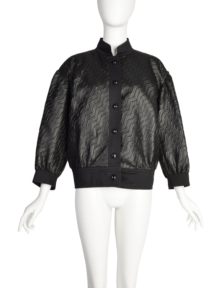 Stunning and rare vintage Yves Saint Laurent jacket from Spring/Summer 1984, shown here documented on the runway. Really unusual and interesting black brocade and woven 'squiggle' metallic bomber-style body. Cotton waistband, placket, cuffs, and standing collar. Dropped shoulder. Roomy, dreamy puffed sleeves. Cleverly concealed pockets at hips. Fully lined in acetate. This jacket is absolutely amazing and trust when we say that the photos here do it absolutely no justice - it will be much better on a real body.